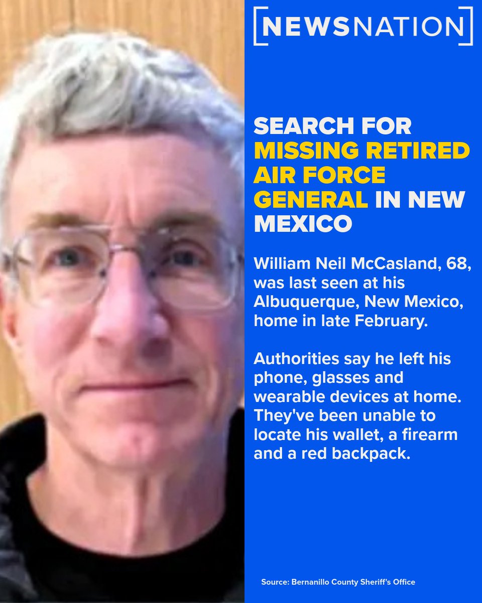 RT @NewsNation: A Silver Alert was issued for William Neil McCasland, a retired Air Force general in New Mexico, who left his home withoutâŠ