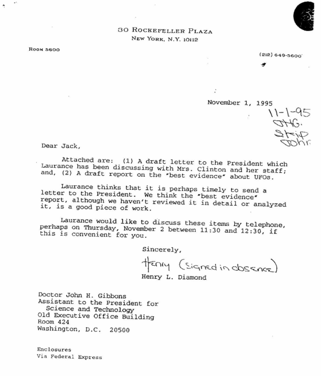 Why ask Hillary Clinton about UFOs? There's a reason, and note the date of the letter... "A letter between environmental lawyer and Clinton Administration friend Henry Diamond and John H Gibbons, Assistant to the President for Science and Technology, states Laurence Rockefeller https://t.co/3J47UFEgFL